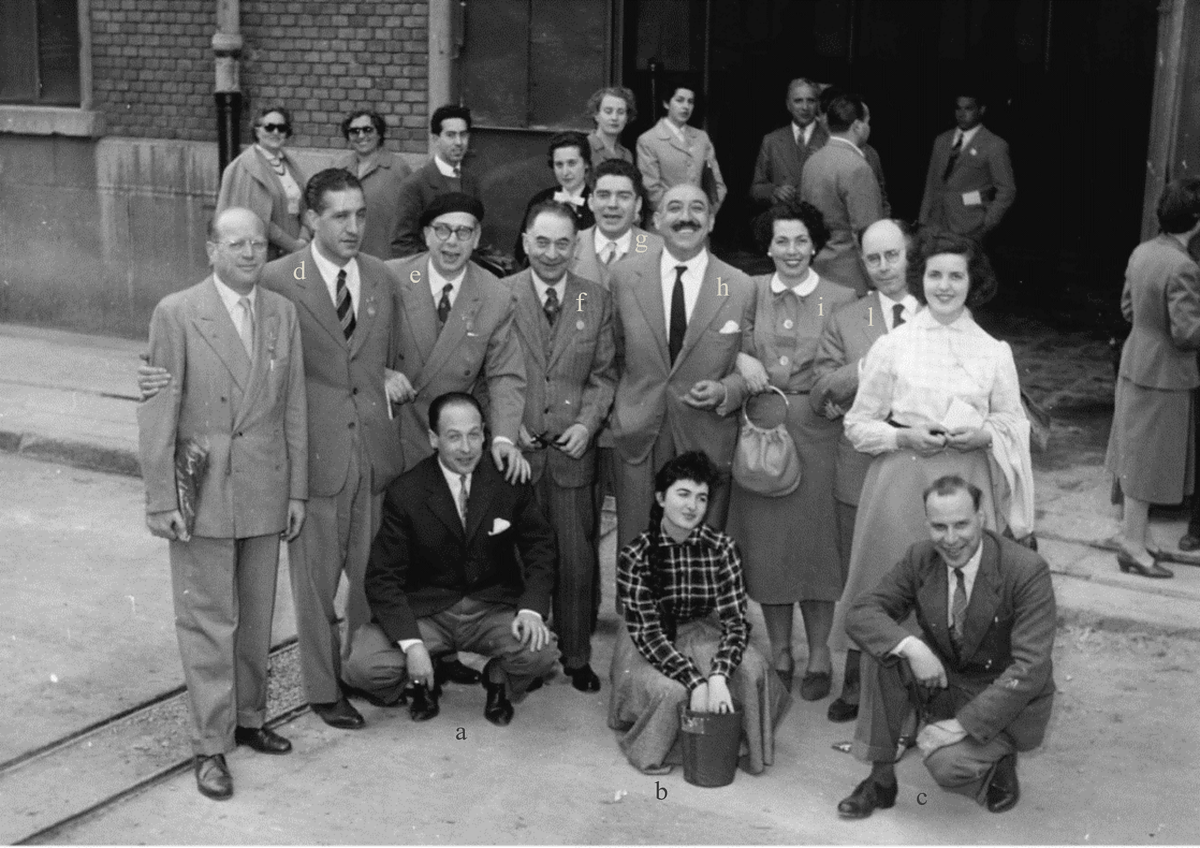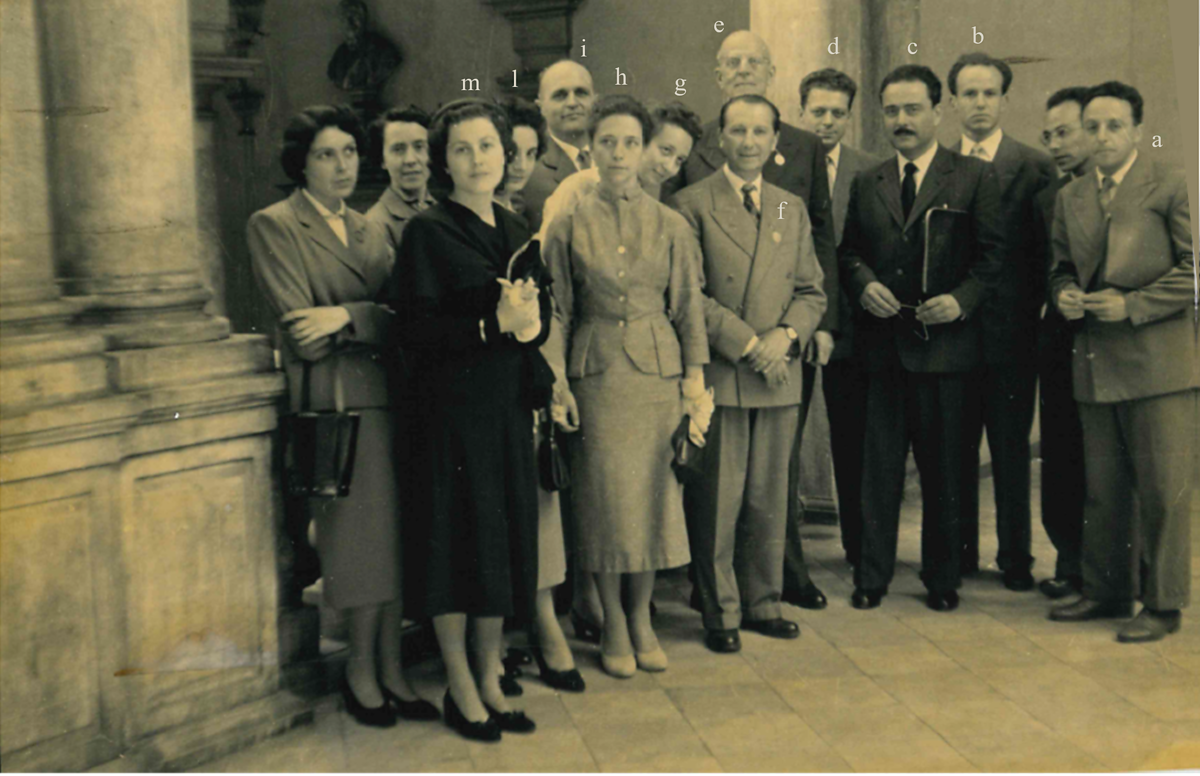 aProf. Aldo Iandelli, bDott. Natalino Gotelli, cProf. Andrea Gandini, dDott. Riccardo Ferro, eProf. Luigi Rolla, fProf. Adolfo Ciurlo, gDott.ssa Piera Vegetti, hDott.ssa Giulia Orestano (figlia del Rettore), iDott. Italo Rossi, lMoglie del Dott. Ferro, mSig.ra Emilia Bonanati in Sparatore