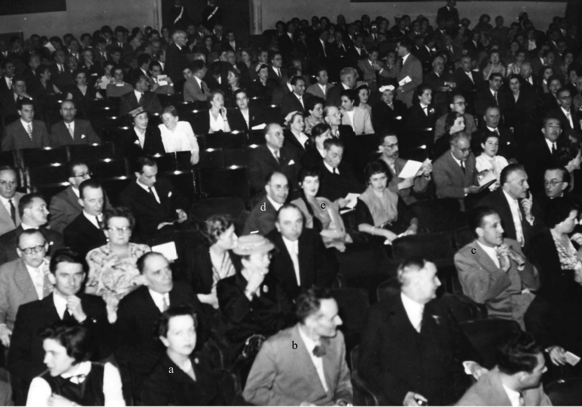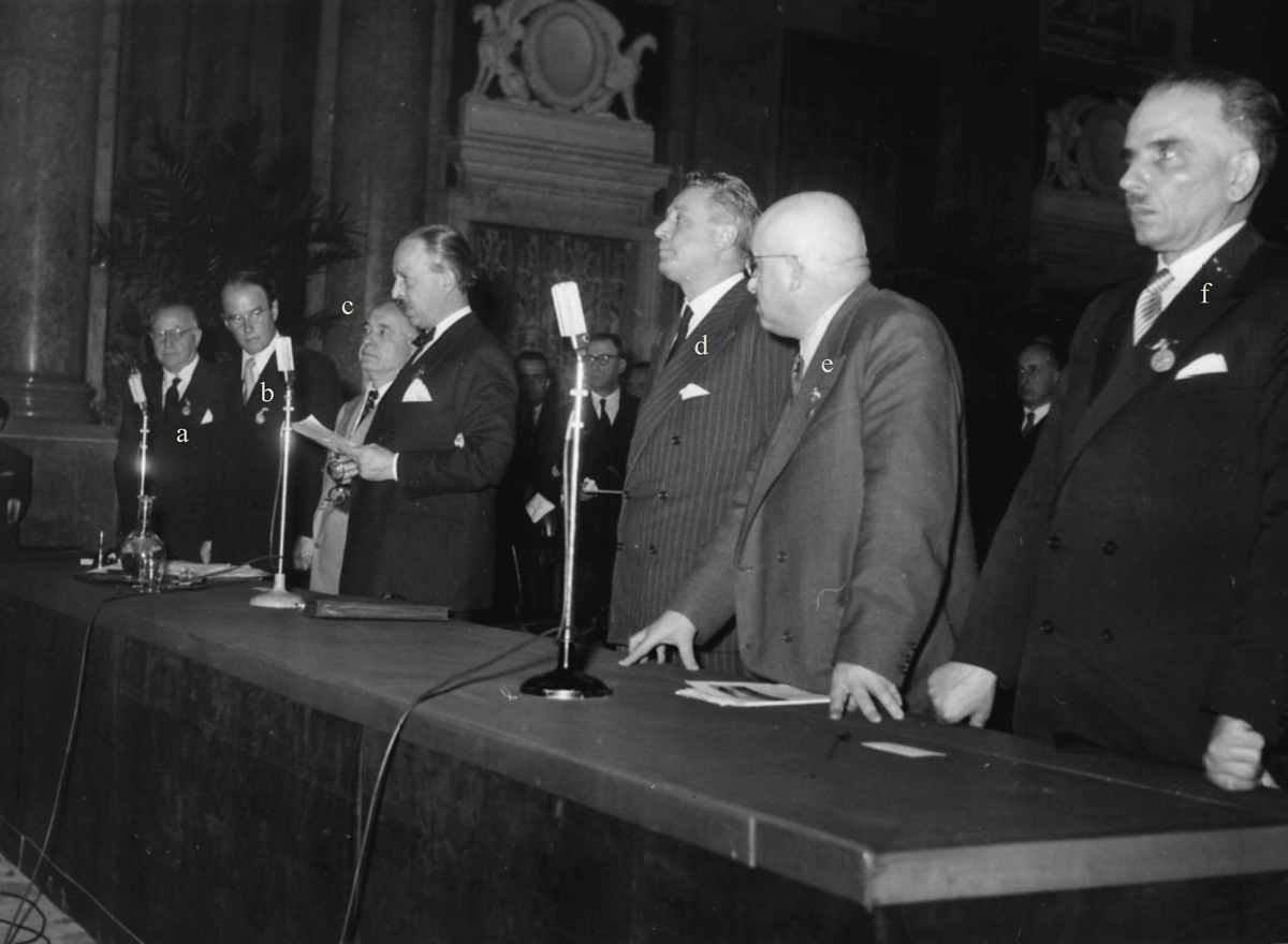 aProf. Domenico Marotta (Presidente SCI, Direttore della Gazzetta Chimica Italiana, Direttore dell’Istituto Superiore di Sanità), bProf. Arne Tiselius (Premio Nobel per la Chimica, inventore dell’elettroforesi), cProf. Remo De Fazi (Presidente della Società Italiana di Scienze Farmaceutiche), dDott. Vittorio Pertusio (Sindaco di Genova – 1951-1966), eProf. Gian Battista Bonino (Preside della Facoltà di Scienze Matematiche, Fisiche e Naturali di Bologna), fProf. Luigi Mazza (Presidente della Sezione Liguria della SCI)