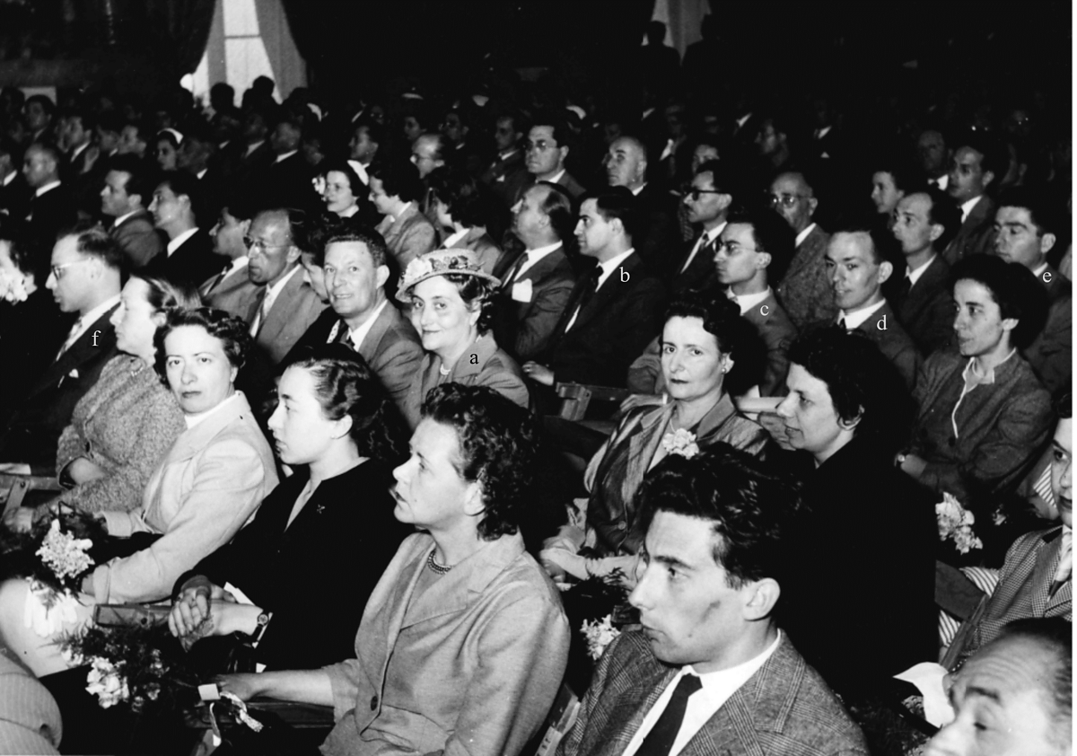 aDott.ssa Filomena Nitti Bovet, bProf. Daniel Bovet (Premio Nobel per la Medicina), cProf. Andrisano, dProf. Semerano, eFiglia del Prof. Semerano